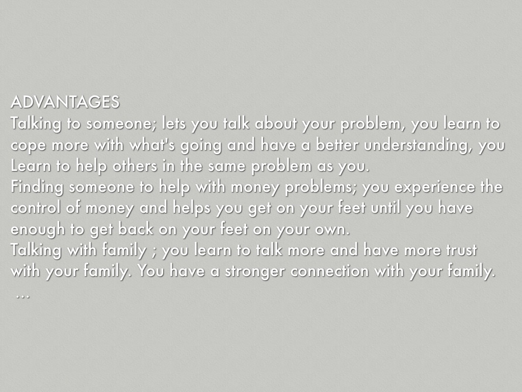 Talking to someone; lets you talk about your problem, you learn to cope more with what's going and have a better understanding, you Learn to help others in the same problem as you.