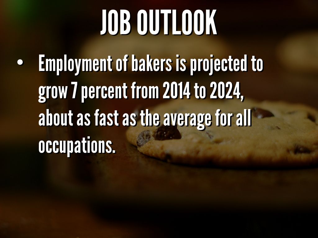 Employment of bakers is projected to grow 7 percent from 2014 to 2024, about as fast as the average for all occupations.