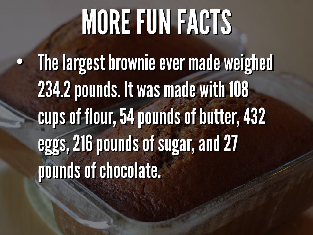 The largest brownie ever made weighed 234.2 pounds. It was made with 108 cups of flour, 54 pounds of butter, 432 eggs, 216 pounds of sugar, and 27 pounds of chocolate.