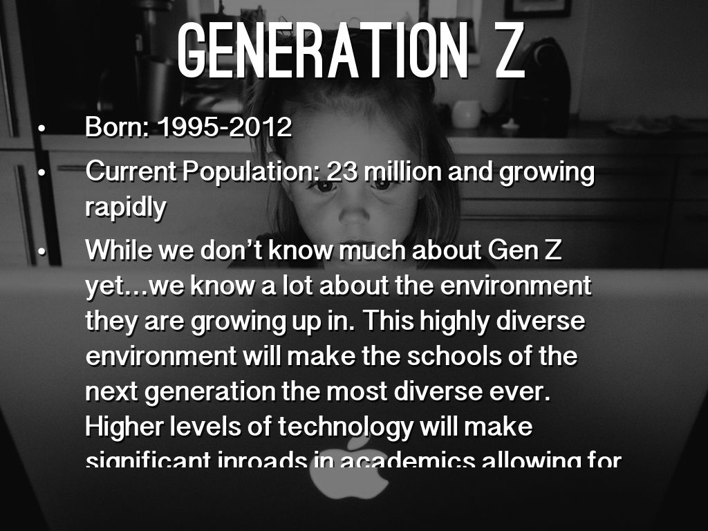 • While we don’t know much about Gen Z yet...we know a lot about the environment they are growing up in. This highly diverse environment will make the schools of the next generation the most diverse ever. Higher levels of technology will make significant inroads in academics allowing for customized instruction, data mining of student histories to enable pinpoint diagnostics and remediation or accelerated achievement opportunities.