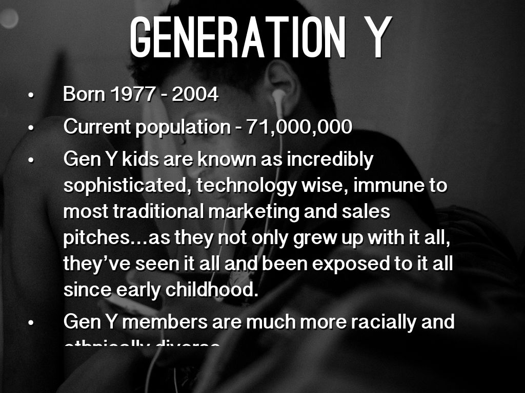 • Gen Y kids are known as incredibly sophisticated, technology wise, immune to most traditional marketing and sales pitches...as they not only grew up with it all, they’ve seen it all and been exposed to it all since early childhood.