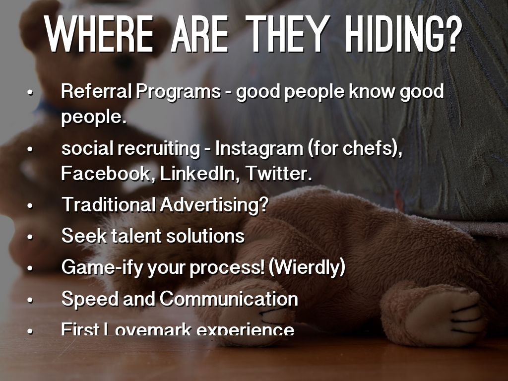 • social recruiting - Instagram (for chefs), Facebook, LinkedIn, Twitter.
