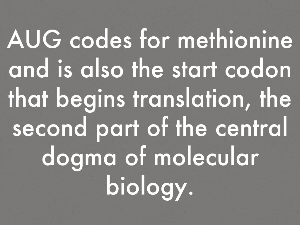 AUG codes for methionine and is also the start codon that begins translation, the second part of the central dogma of molecular biology.