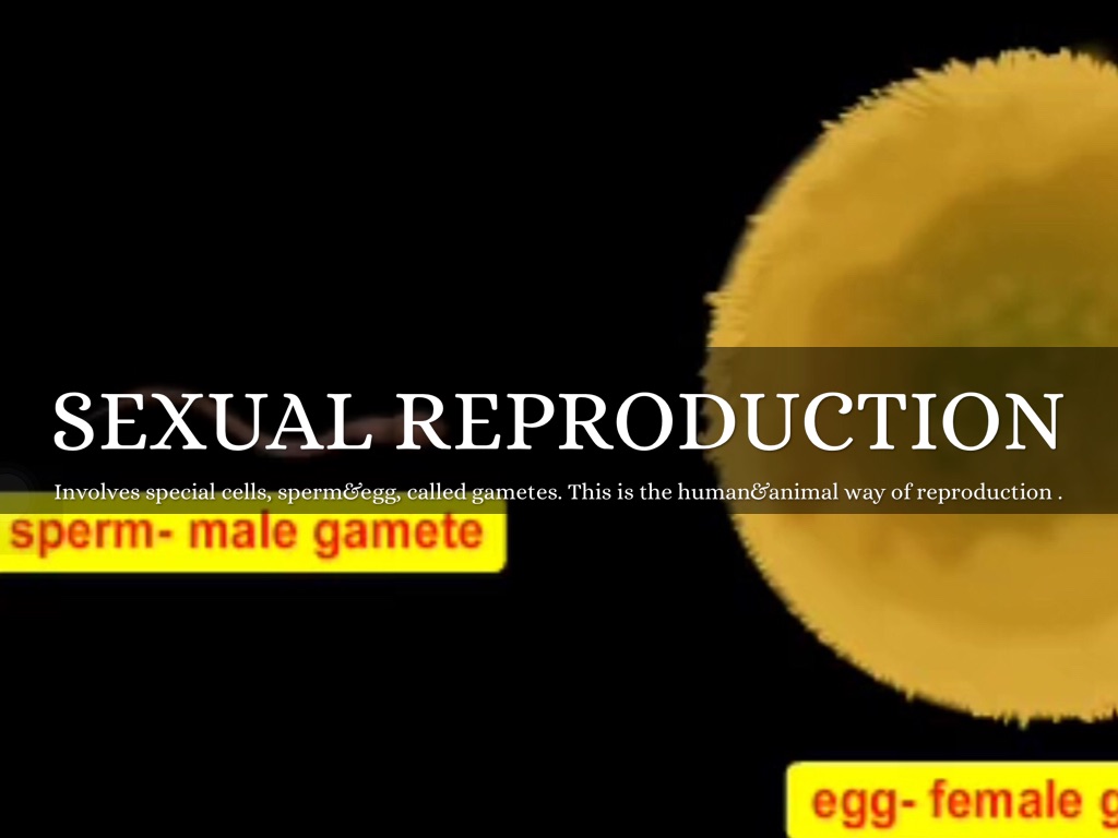 Involves special cells, sperm&egg, called gametes. This is the human&animal way of reproduction .