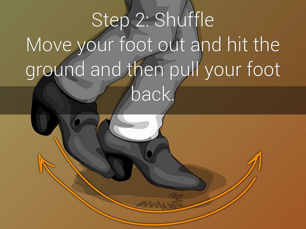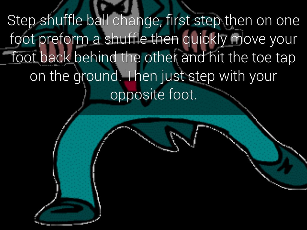 Step shuffle ball change, first step then on one foot preform a shuffle then quickly move your foot back behind the other and hit the toe tap on the ground. Then just step with your opposite foot.