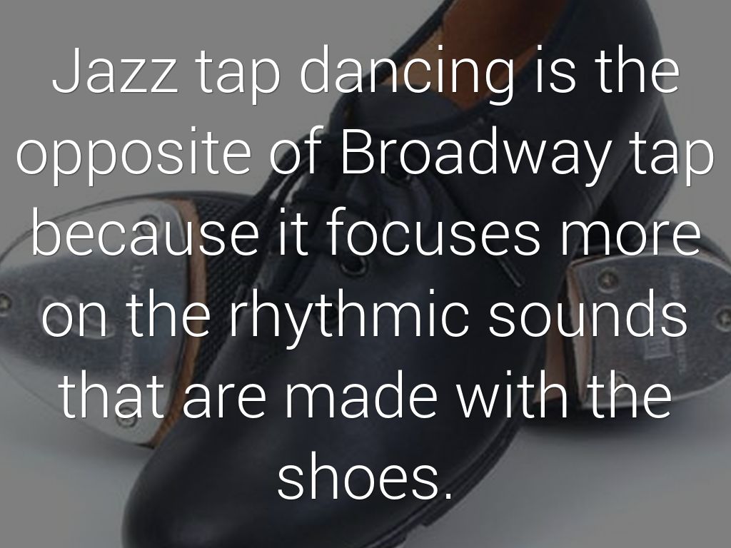 Jazz tap dancing is the opposite of Broadway tap because it focuses more on the rhythmic sounds that are made with the shoes.