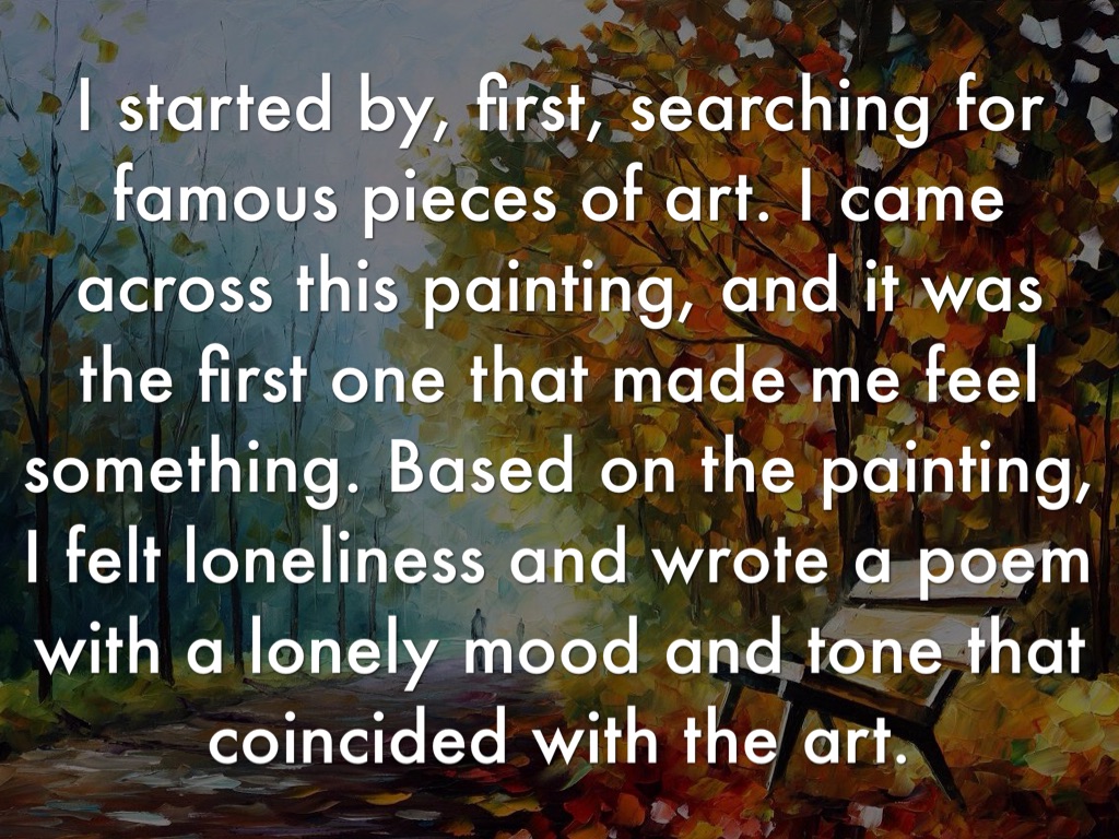 I started by, first, searching for famous pieces of art. I came across this painting, and it was the first one that made me feel something. Based on the painting, I felt loneliness and wrote a poem with a lonely mood and tone that coincided with the art.
