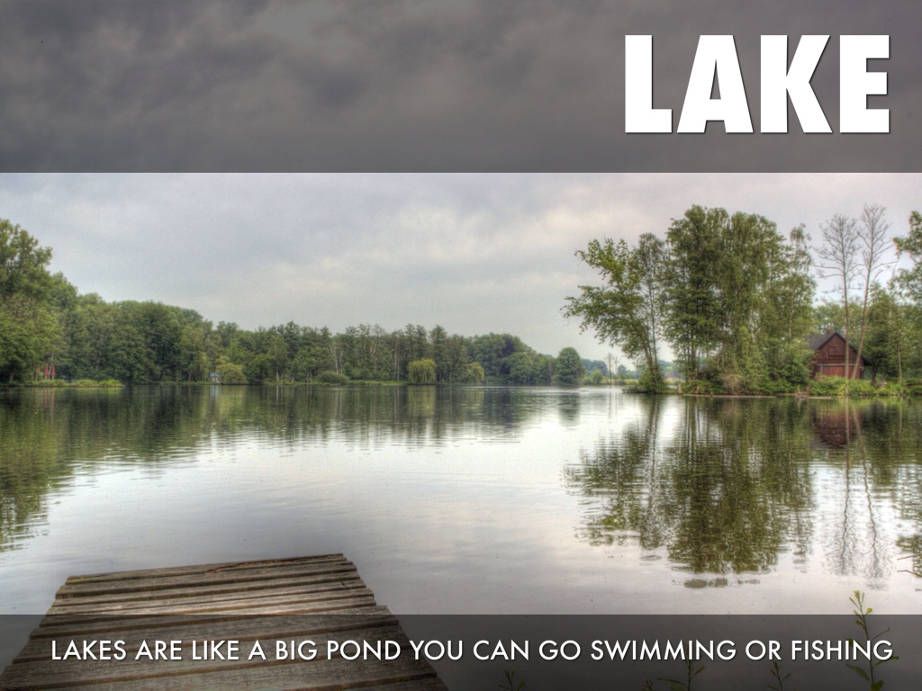 LAKES ARE LIKE A BIG POND YOU CAN GO SWIMMING OR FISHING