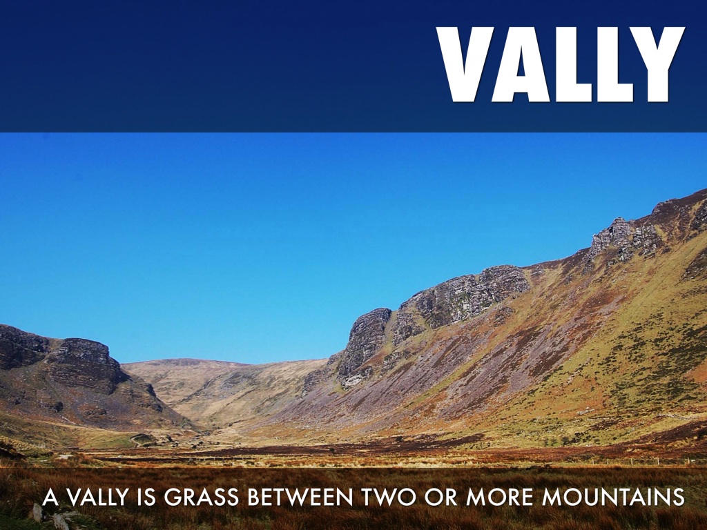A VALLY IS GRASS BETWEEN TWO OR MORE MOUNTAINS
