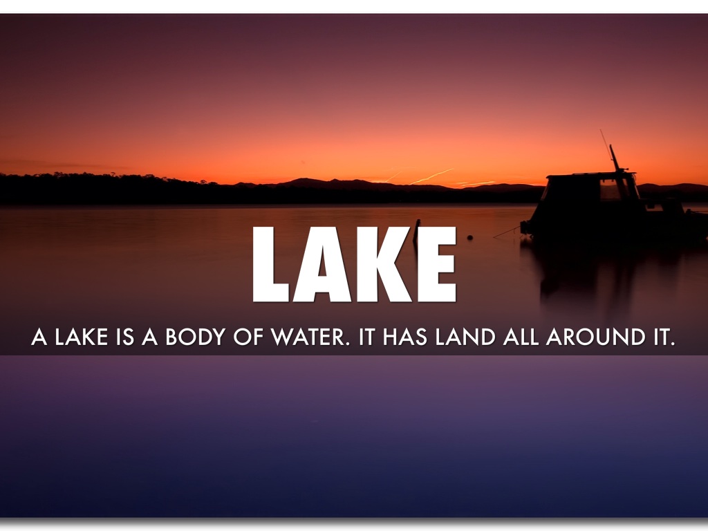 A LAKE IS A BODY OF WATER. IT HAS LAND ALL AROUND IT.