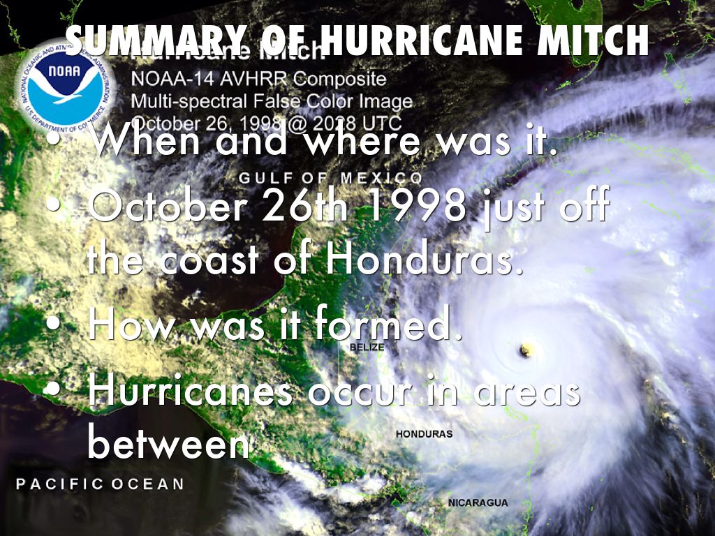The effects of Hurricane Mitch in Honduras included the worst flooding in Honduras in the 20th century. Hurricane Mitch, the strongest storm of the 1998 Atlantic hurricane season, formed on October 22, and after becoming a Category 5 hurricane, it weakened and struck Honduras on October 29. While near peak intensity, Mitch struck the offshore Guanaja island, where it nearly destroyed the mangrove forest.