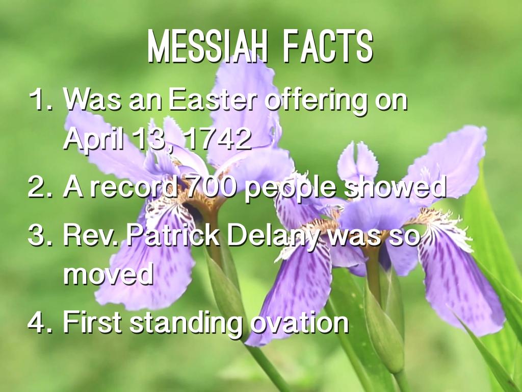 George Frideric Handel's Messiah was originally an Easter offering. It came onto the stage of Musick Hall in Dublin on April 13, 1742. The audience grew to a record 700, as ladies had been told by management to wear dresses "without Hoops" in order to make "Room for more company." The audience sat mesmerized when they listened to Handel’s masterpiece. During the song, Rev. Patrick Delany was so moved by the music he said, “Woman, for this be all thy sins forgiven thee!" And do you who how standing ovations got started? Well, after a famous oratorio, the king stood up. Scholars don’t exactly know why, but they do know what oratorio it was, it was Handel’s Messiah.