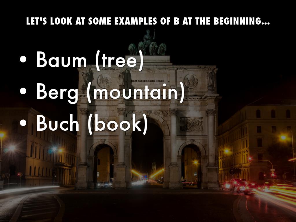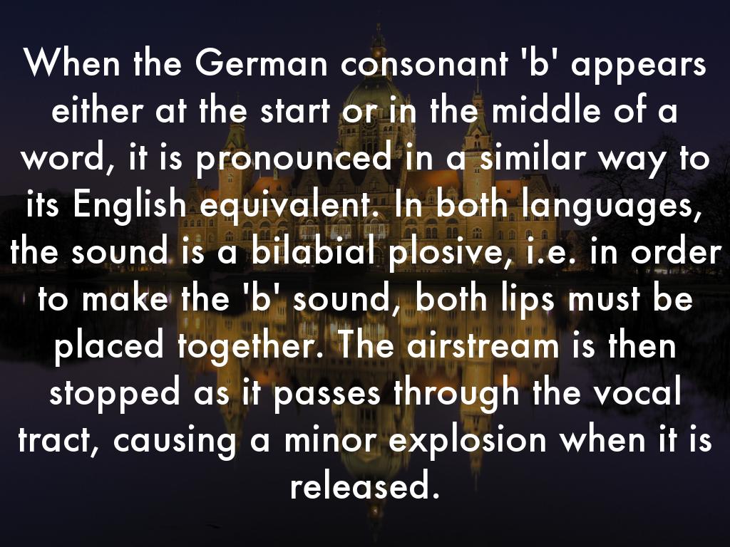 When the German consonant 'b' appears either at the start or in the middle of a word, it is pronounced in a similar way to its English equivalent. In both languages, the sound is a bilabial plosive, i.e. in order to make the 'b' sound, both lips must be placed together. The airstream is then stopped as it passes through the vocal tract, causing a minor explosion when it is released.