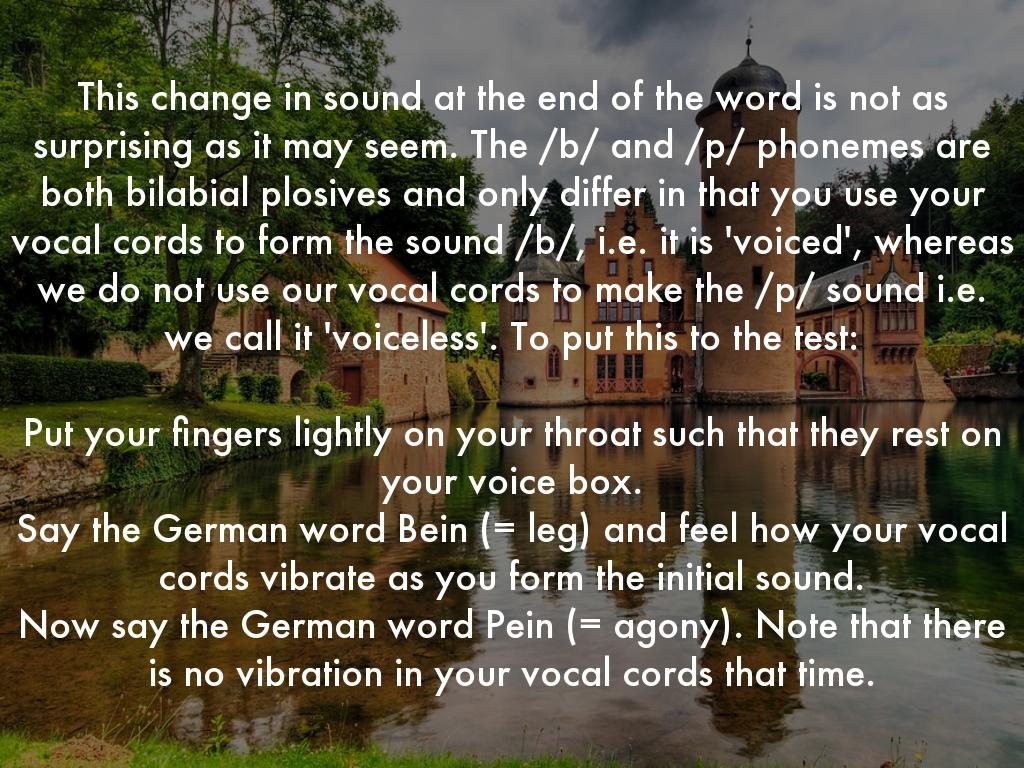 Say the German word Bein (= leg) and feel how your vocal cords vibrate as you form the initial sound.
