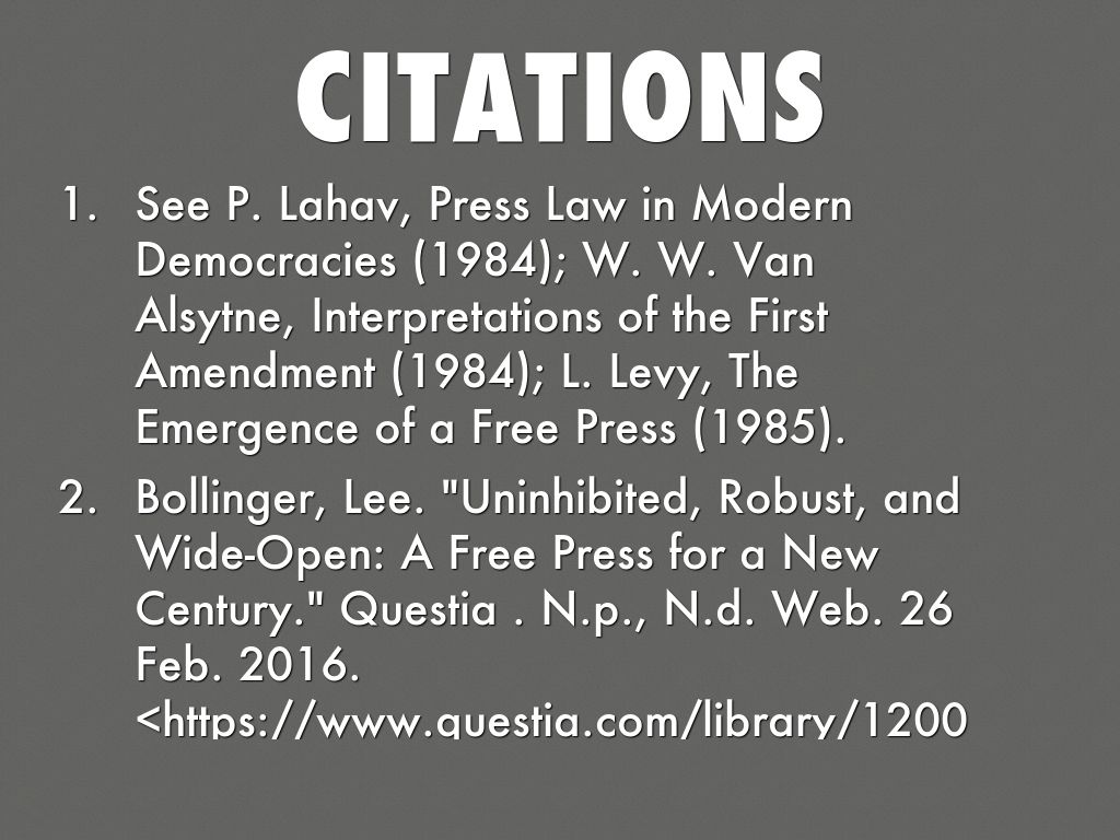 Bollinger, Lee. "Uninhibited, Robust, and Wide-Open: A Free Press for a New Century." Questia . N.p., N.d. Web. 26 Feb. 2016. .