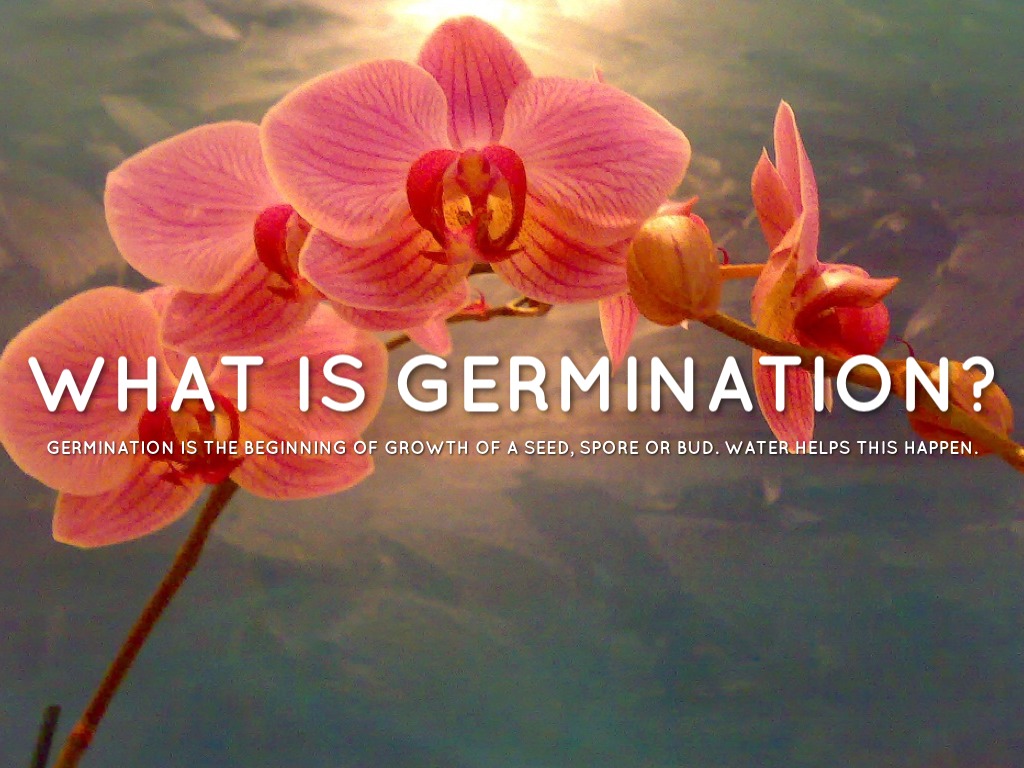 GERMINATION IS THE BEGINNING OF GROWTH OF A SEED, SPORE OR BUD. WATER HELPS THIS HAPPEN.