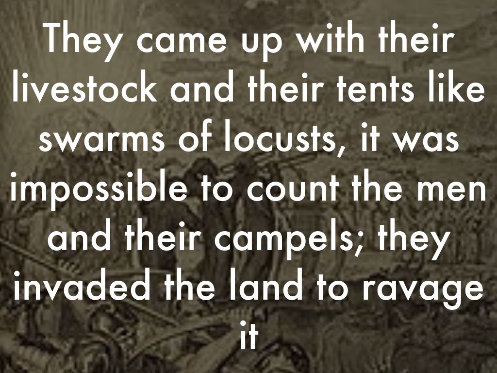 They came up with their livestock and their tents like swarms of locusts, it was impossible to count the men and their campels; they invaded the land to ravage it