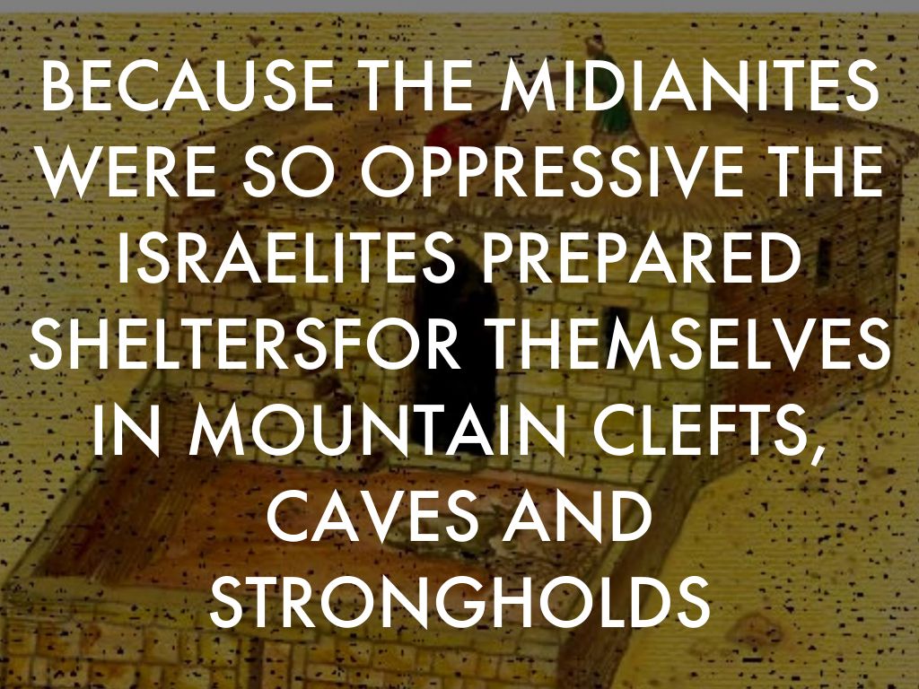 BECAUSE THE MIDIANITES WERE SO OPPRESSIVE THE ISRAELITES PREPARED SHELTERSFOR THEMSELVES IN MOUNTAIN CLEFTS, CAVES AND STRONGHOLDS