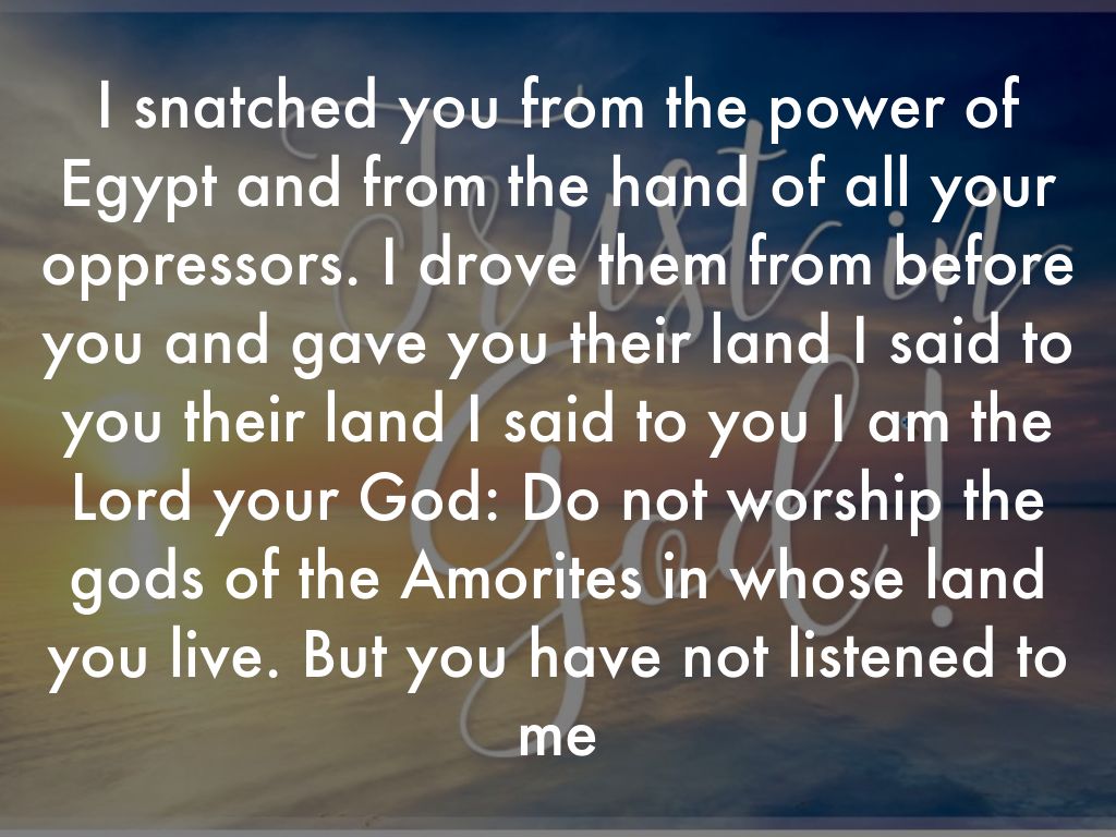 I snatched you from the power of Egypt and from the hand of all your oppressors. I drove them from before you and gave you their land I said to you their land I said to you I am the Lord your God: Do not worship the gods of the Amorites in whose land you live. But you have not listened to me