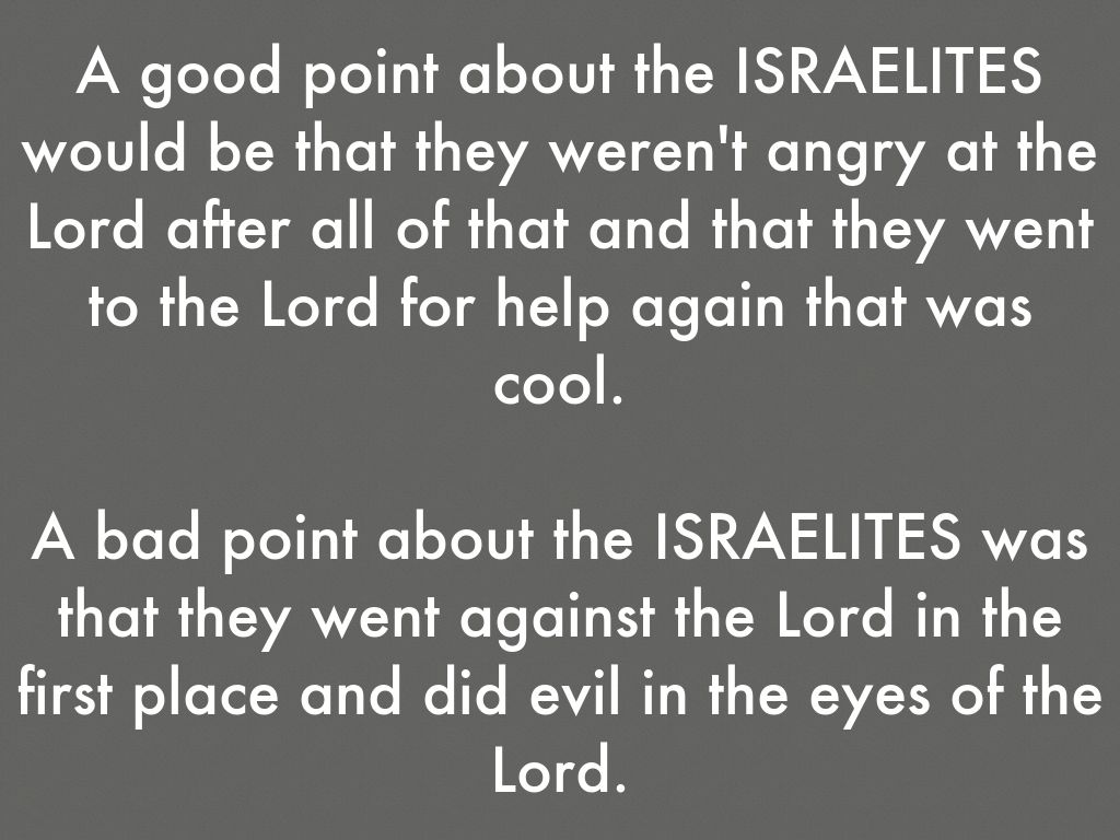 A good point about the ISRAELITES would be that they weren't angry at the Lord after all of that and that they went to the Lord for help again that was cool.