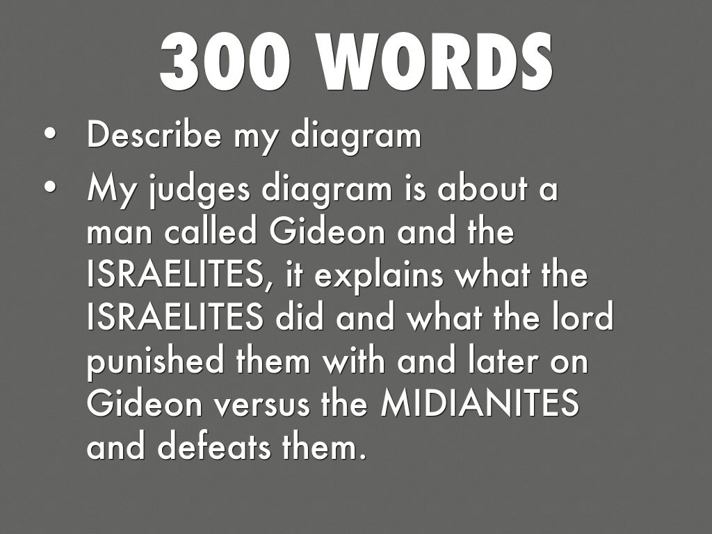 - My judges diagram is about a man called Gideon and the ISRAELITES, it explains what the ISRAELITES did and what the lord punished them with and later on Gideon versus the MIDIANITES and defeats them.