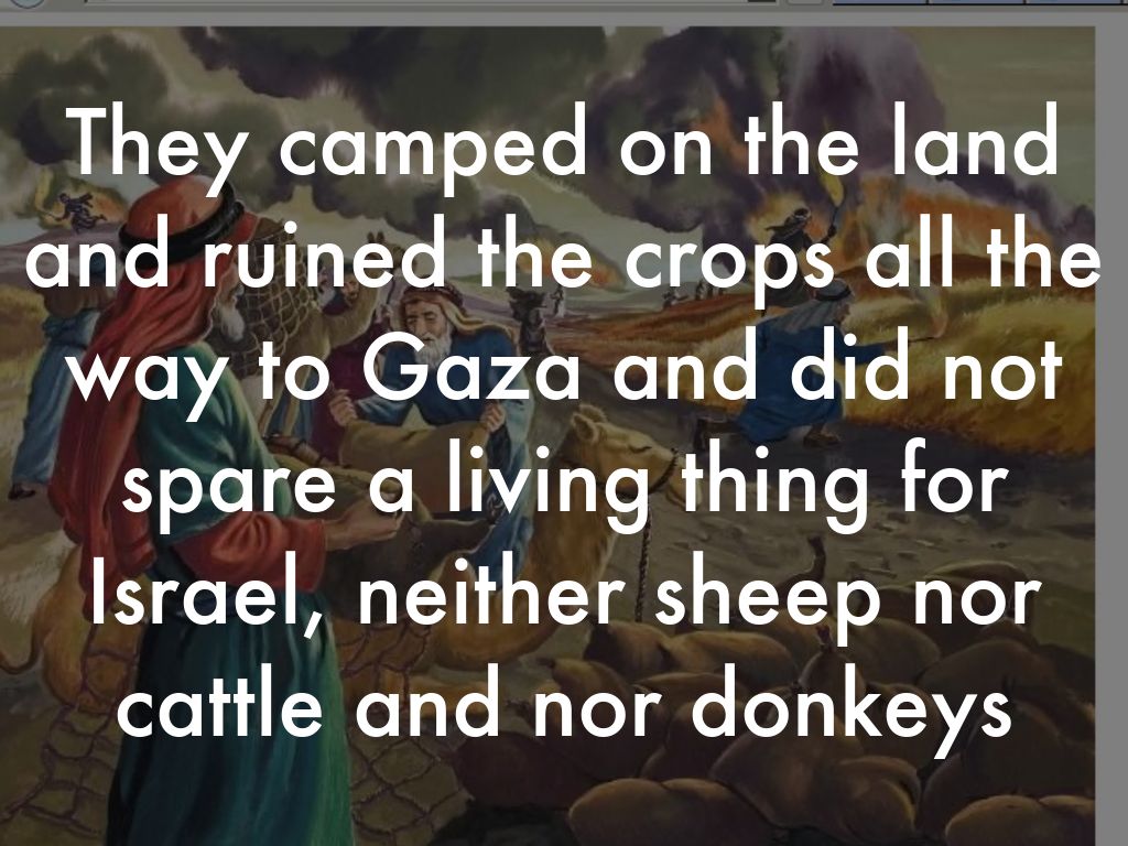 They camped on the land and ruined the crops all the way to Gaza and did not spare a living thing for Israel, neither sheep nor cattle and nor donkeys