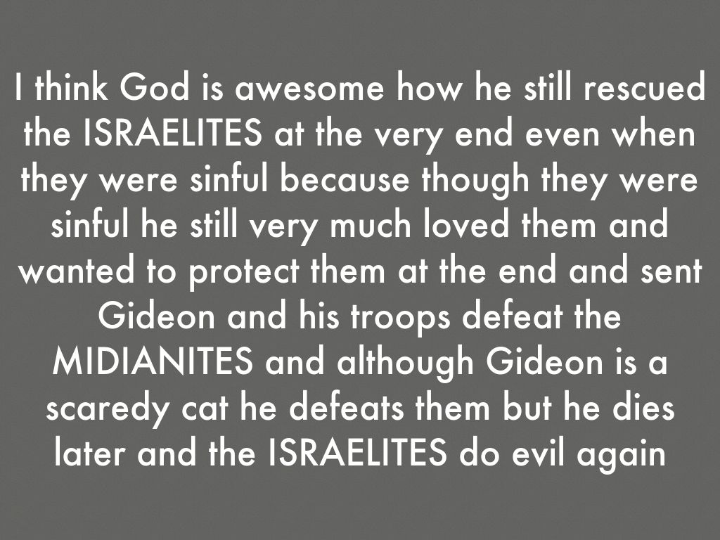 I think God is awesome how he still rescued the ISRAELITES at the very end even when they were sinful because though they were sinful he still very much loved them and wanted to protect them at the end and sent Gideon and his troops defeat the MIDIANITES and although Gideon is a scaredy cat he defeats them but he dies later and the ISRAELITES do evil again