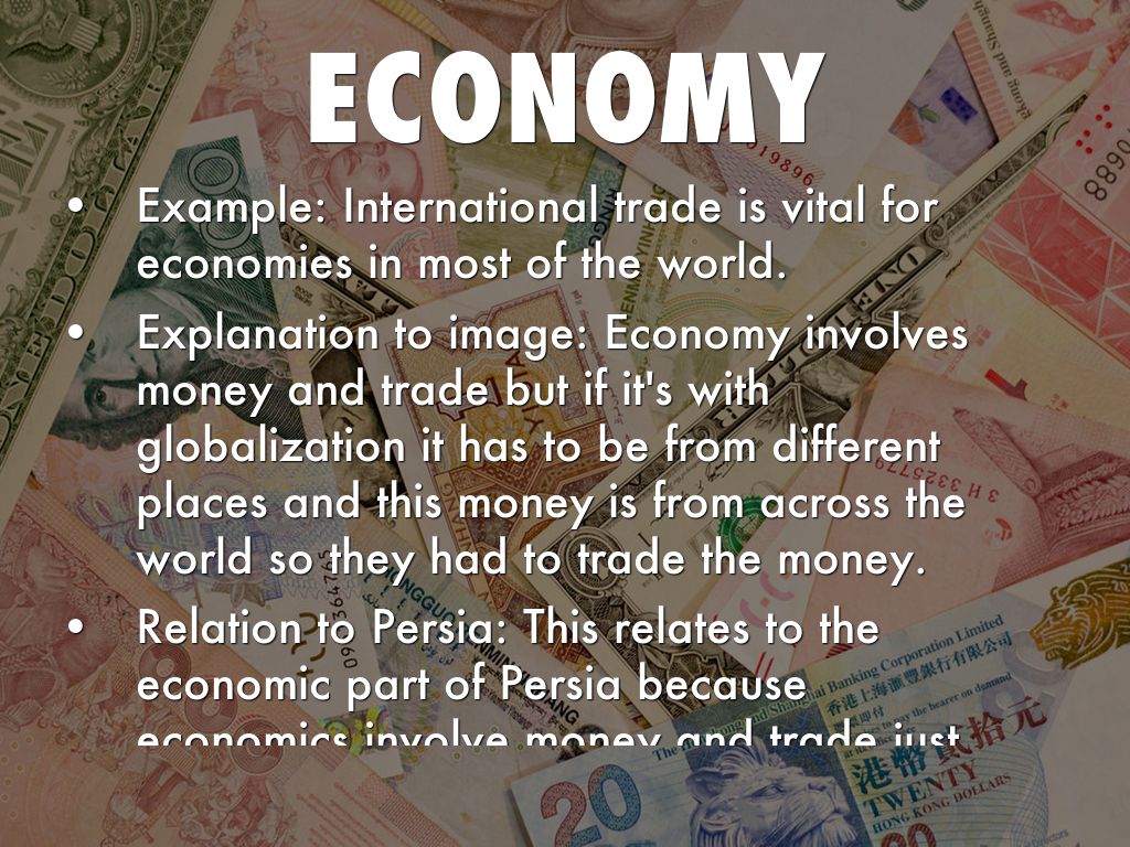 Relation to Persia: This relates to the economic part of Persia because economics involve money and trade just like economy, they are different forms of almost the same word and they both can be around the world (globalization).