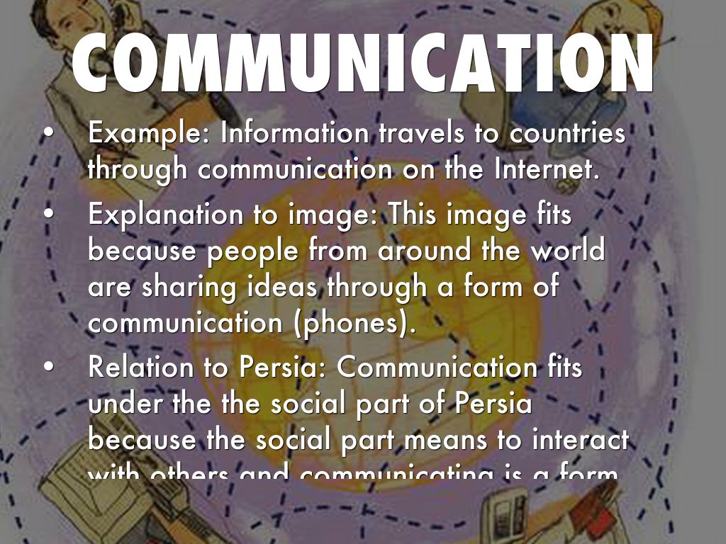 Relation to Persia: Communication fits under the the social part of Persia because the social part means to interact with others and communicating is a form of interacting.