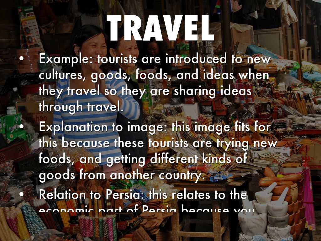 Example: tourists are introduced to new cultures, goods, foods, and ideas when they travel so they are sharing ideas through travel.
