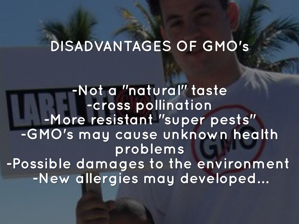 -Not a "natural" taste -cross pollination -More resistant "super pests" -GMO's may cause unknown health problems -Possible damages to the environment -New allergies may developed
