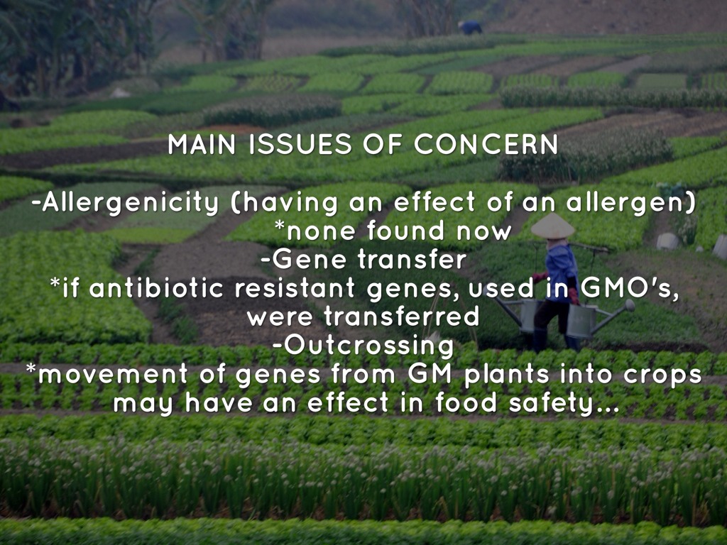 -Allergenicity (having an effect of an allergen) *none found now -Gene transfer *if antibiotic resistant genes, used in GMO's, were transferred -Outcrossing *movement of genes from GM plants into crops may have an effect in food safety