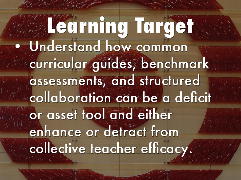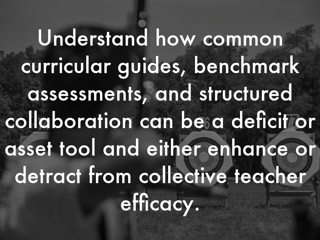 - Understand how common curricular guides, benchmark assessments, and structured collaboration can be a deficit or asset tool and either enhance or detract from collective teacher efficacy.