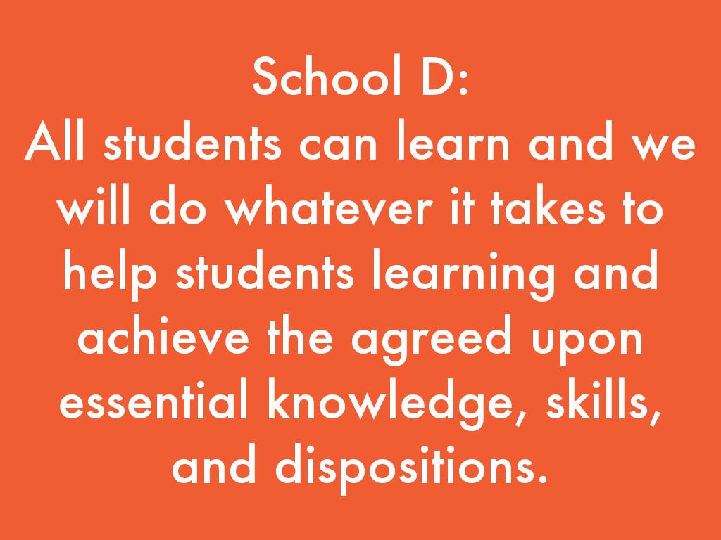 All students can learn and we will do whatever it takes to help students learning and achieve the agreed upon essential knowledge, skills, and dispositions.