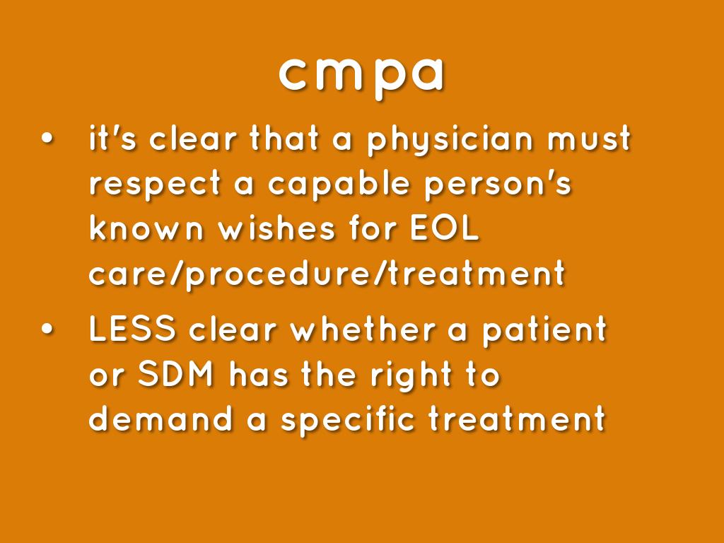 - it's clear that a physician must respect a capable person's known wishes for EOL care/procedure/treatment