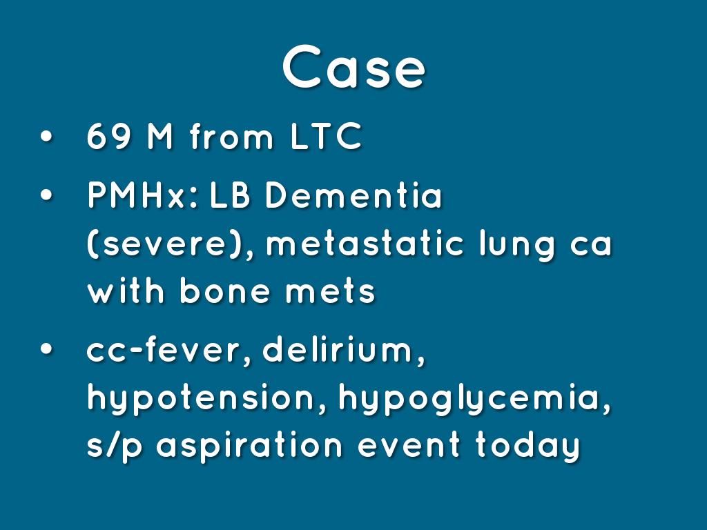 - PMHx: LB Dementia (severe), metastatic lung ca with bone mets