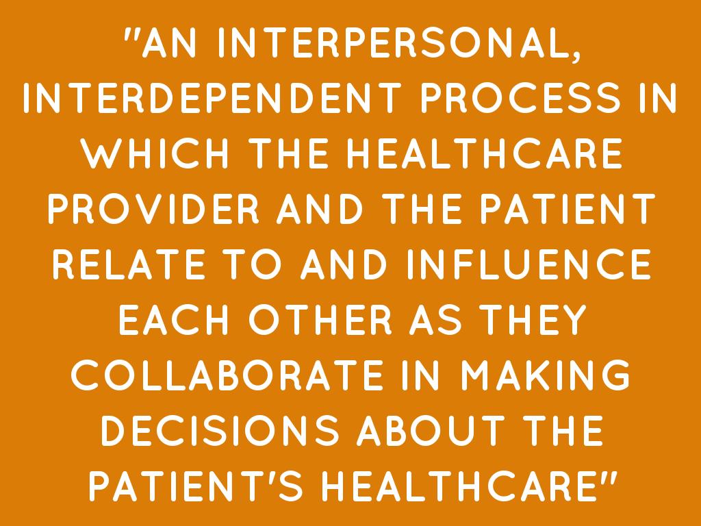 "AN INTERPERSONAL, INTERDEPENDENT PROCESS IN WHICH THE HEALTHCARE PROVIDER AND THE PATIENT RELATE TO AND INFLUENCE EACH OTHER AS THEY COLLABORATE IN MAKING DECISIONS ABOUT THE PATIENT'S HEALTHCARE"