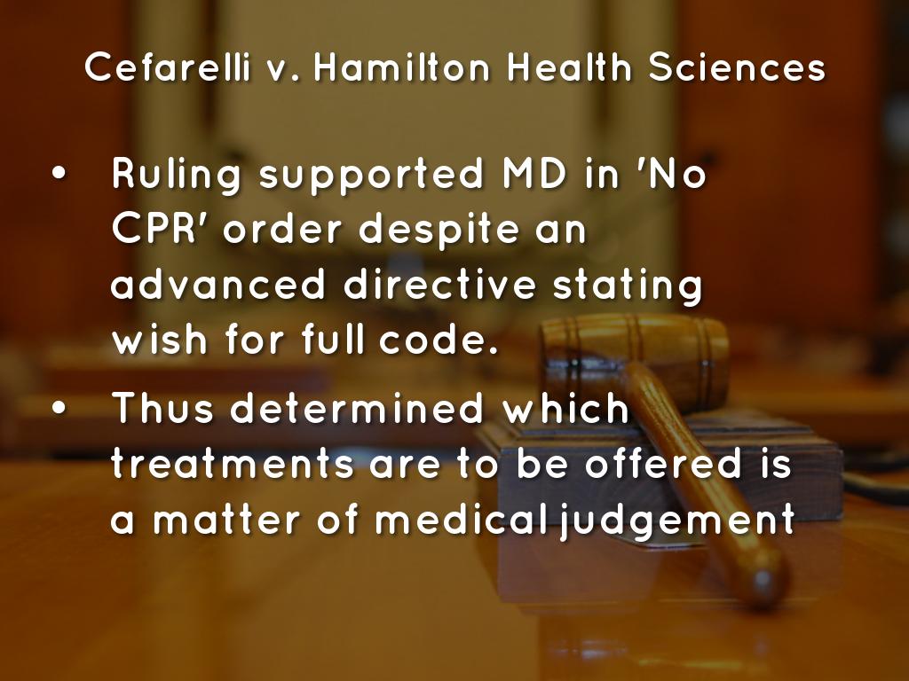 - Ruling supported MD in 'No CPR' order despite an advanced directive stating wish for full code.