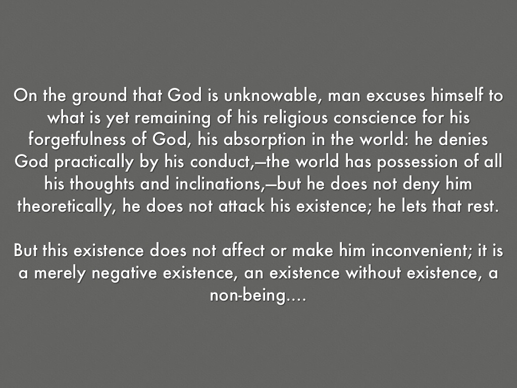 On the ground that God is unknowable, man excuses himself to what is yet remaining of his religious conscience for his forgetfulness of God, his absorption in the world: he denies God practically by his conduct,—the world has possession of all his thoughts and inclinations,—but he does not deny him theoretically, he does not attack his existence; he lets that rest.