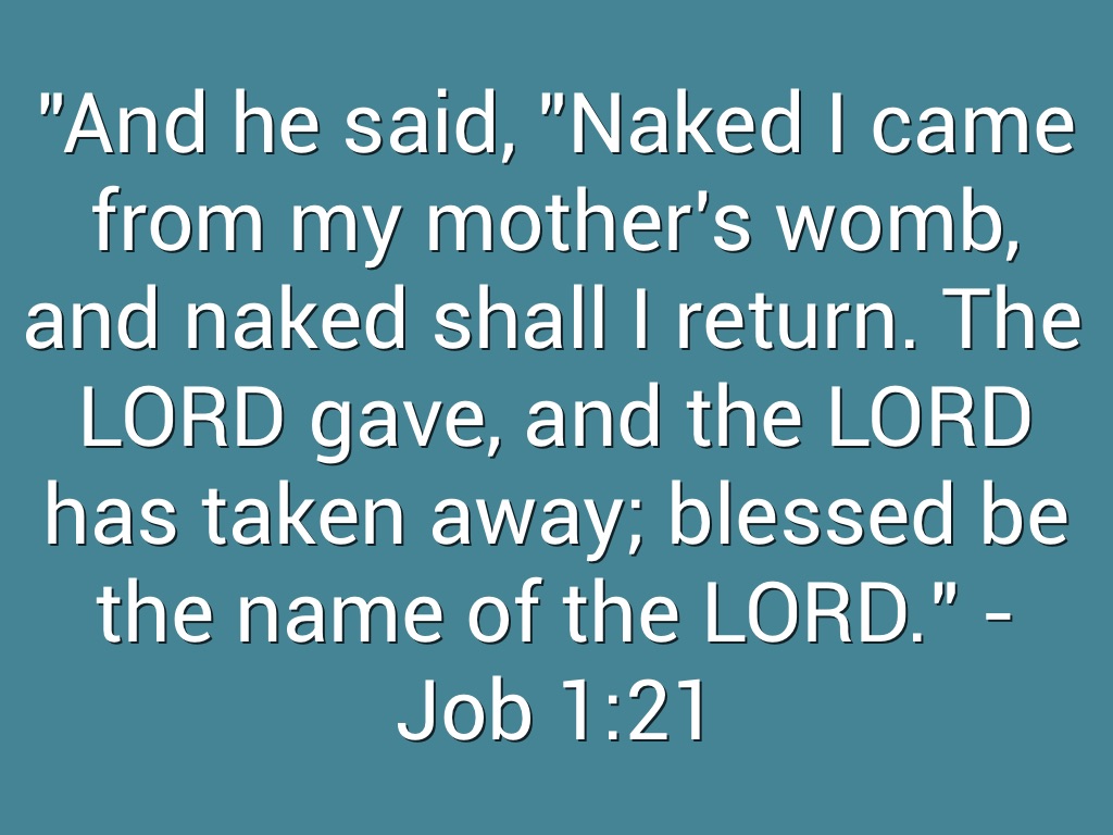 "And he said, "Naked I came from my mother's womb, and naked shall I return. The LORD gave, and the LORD has taken away; blessed be the name of the LORD." - Job 1:21