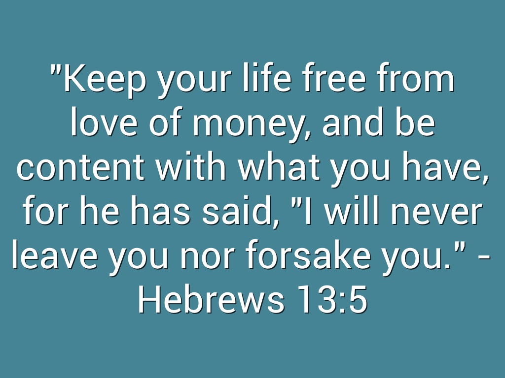 "Keep your life free from love of money, and be content with what you have, for he has said, "I will never leave you nor forsake you." - Hebrews 13:5