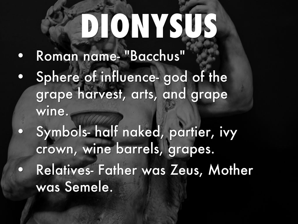 Sphere of influence- god of the grape harvest, arts, and grape wine.