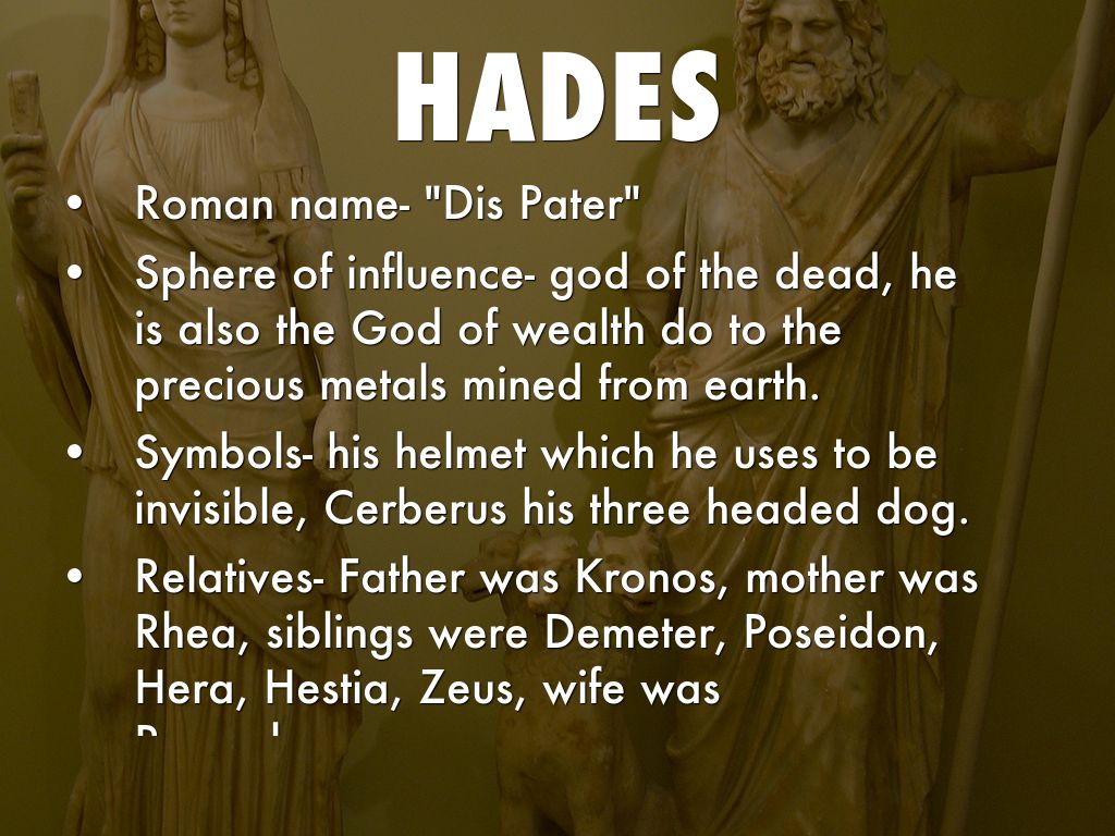 Relatives- Father was Kronos, mother was Rhea, siblings were Demeter, Poseidon, Hera, Hestia, Zeus, wife was Persephone.