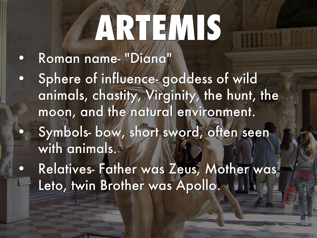 Sphere of influence- goddess of wild animals, chastity, Virginity, the hunt, the moon, and the natural environment.