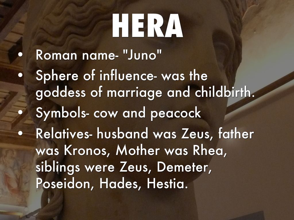 Relatives- husband was Zeus, father was Kronos, Mother was Rhea, siblings were Zeus, Demeter, Poseidon, Hades, Hestia.