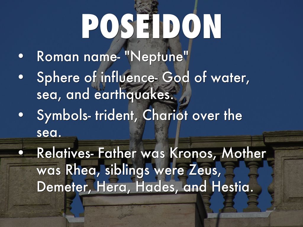 Relatives- Father was Kronos, Mother was Rhea, siblings were Zeus, Demeter, Hera, Hades, and Hestia.