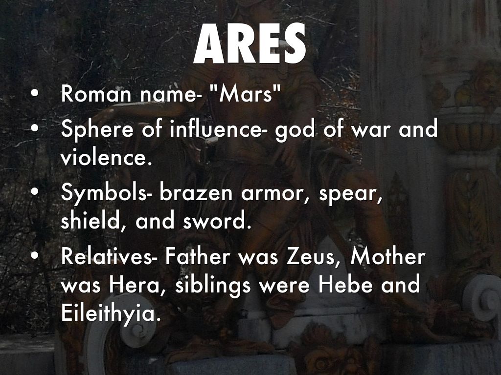 Relatives- Father was Zeus, Mother was Hera, siblings were Hebe and Eileithyia.