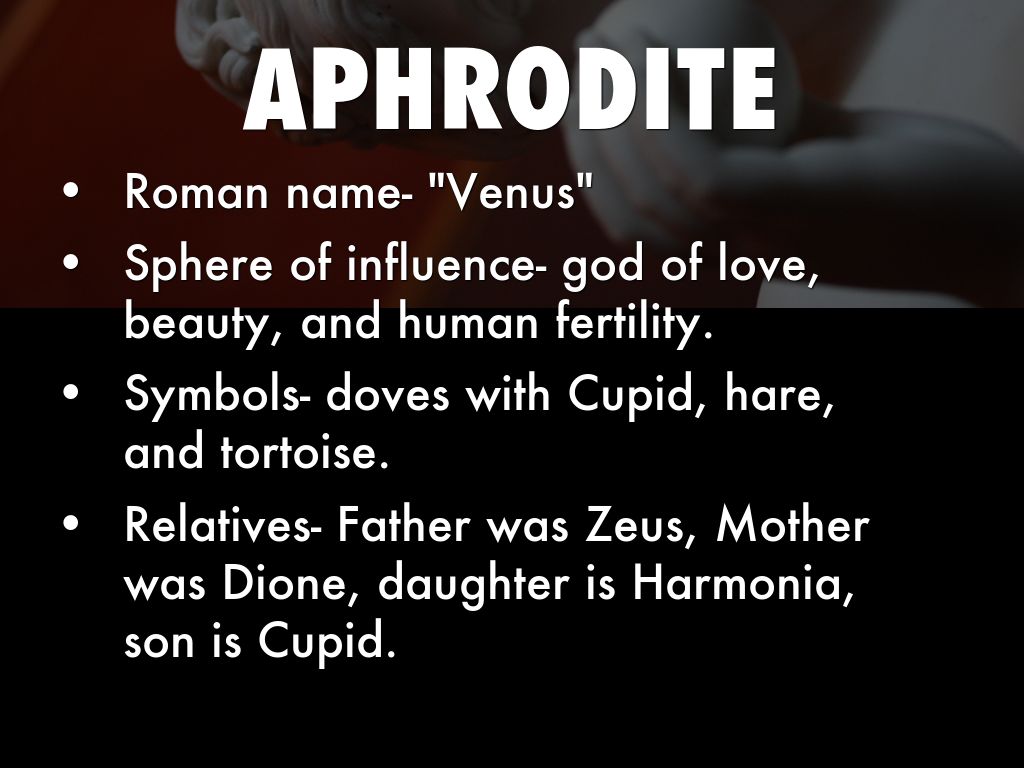 Relatives- Father was Zeus, Mother was Dione, daughter is Harmonia, son is Cupid.