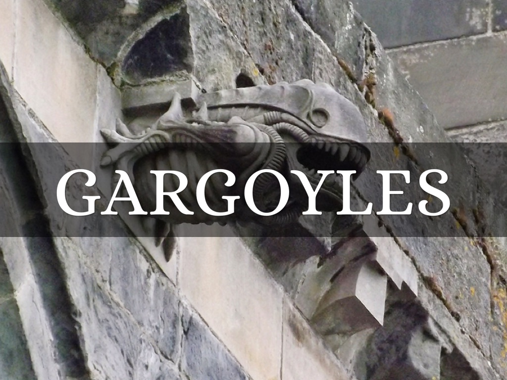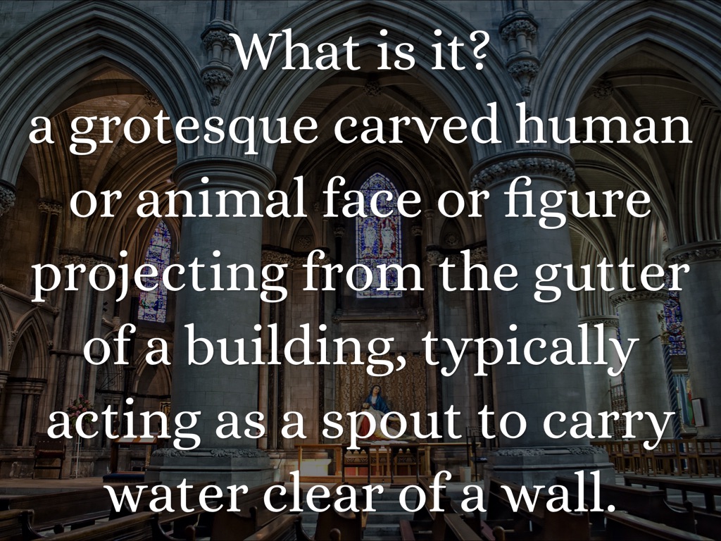 a grotesque carved human or animal face or figure projecting from the gutter of a building, typically acting as a spout to carry water clear of a wall.