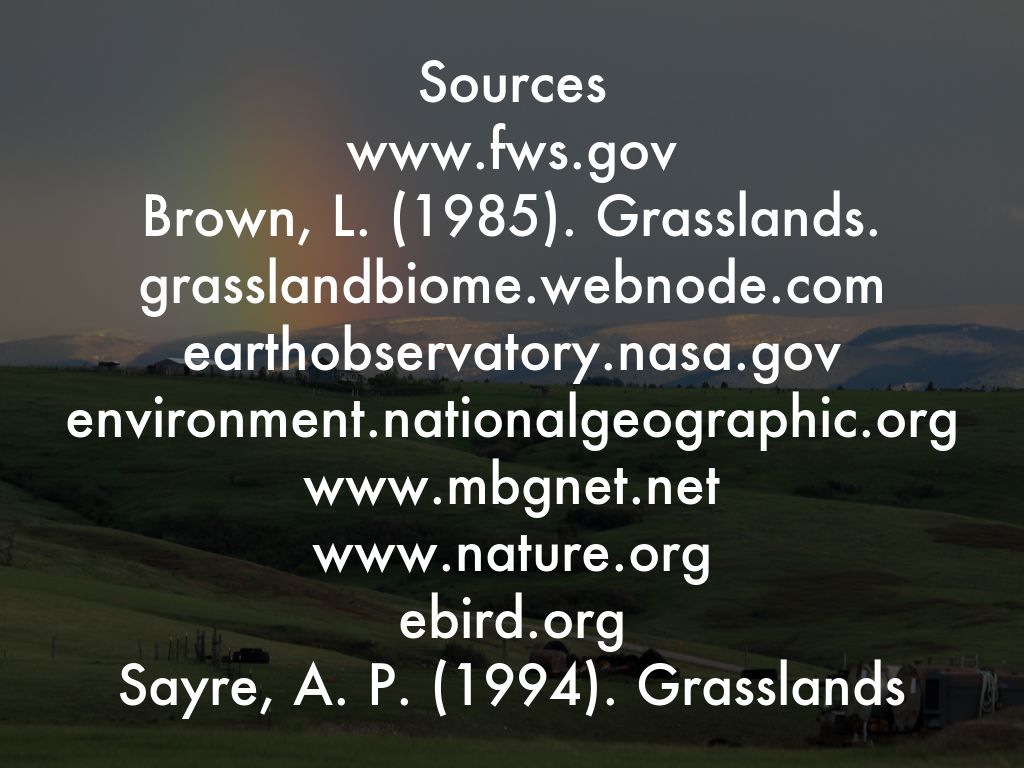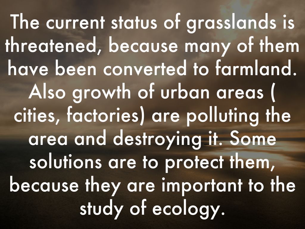 The current status of grasslands is threatened, because many of them have been converted to farmland. Also growth of urban areas ( cities, factories) are polluting the area and destroying it. Some solutions are to protect them, because they are important to the study of ecology.